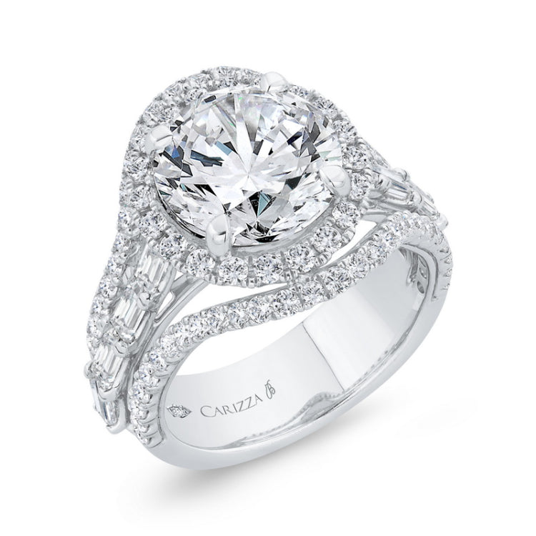 Split Shank Diamond Halo Engagement Ring in 14K White Gold (Semi-Mount), Side Stone Shape: Round & Baguette, Side Stone Color: FG, Side Stone: 86