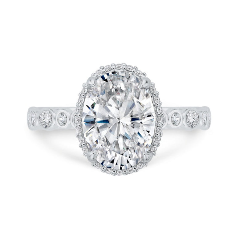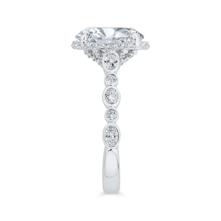 Oval Cut Diamond Halo Engagement Ring in 18K White Gold (Semi-Mount), Side Stone Shape: Round+Oval, Side Stone Color: GH, Side Stone: 63
