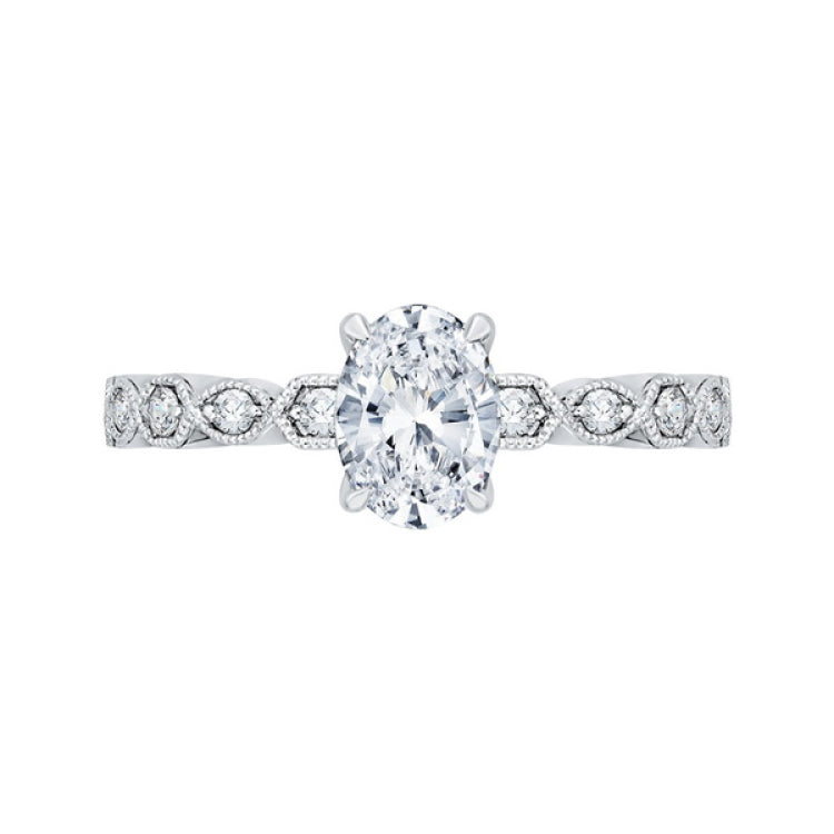 Oval Cut Diamond Floral Engagement Ring in 14K White Gold (Semi-Mount), Side Stone Shape: Round, Side Stone Color: GH, Side Stone: 19