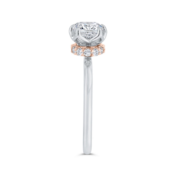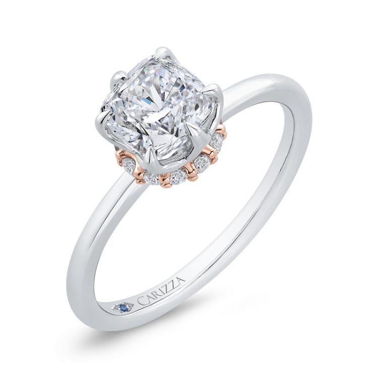 14K Two Tone Gold Cushion Cut Diamond Solitaire Engagement Ring (Semi-Mount), Side Stone Shape: Round, Side Stone Color: GH, Side Stone: 13