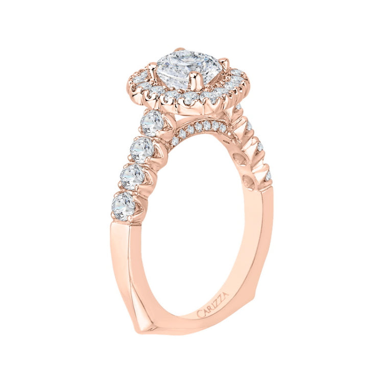 Cushion Cut Diamond Halo Engagement Ring with Band in 14K Rose Gold (Semi-Mount), Side Stone Shape: Round, Side Stone Color: GH, Side Stone: 39