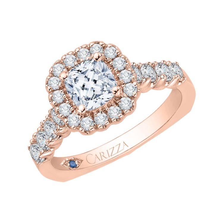 Cushion Cut Diamond Halo Engagement Ring with Band in 14K Rose Gold (Semi-Mount)