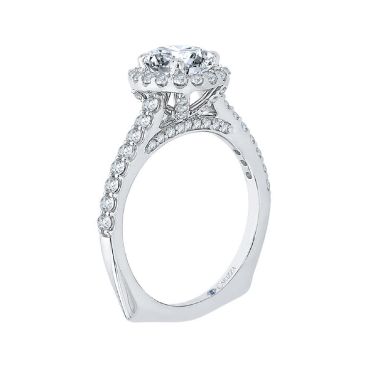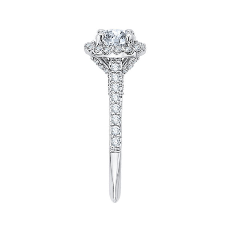Princess Cut Diamond Halo Engagement Ring with Band in 14K White Gold (Semi-Mount), Side Stone Shape: Round, Side Stone Color: GH, Side Stone: 63