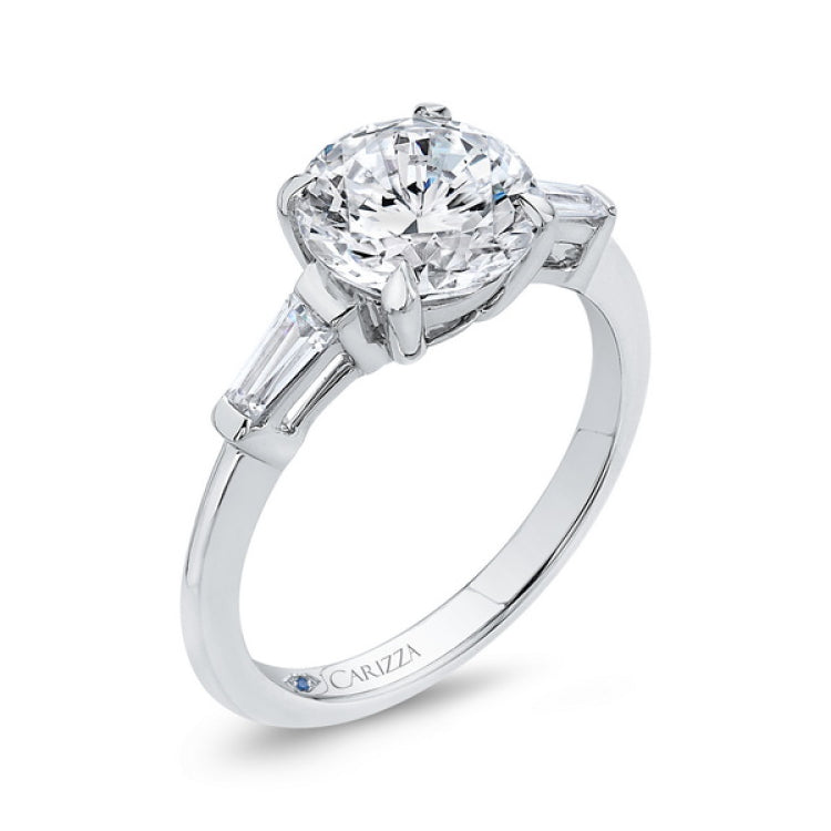 Round Diamond Classic Engagement Ring in 14K White Gold (Semi-Mount), Side Stone Shape: Emerald, Side Stone Color: GH, Side Stone: 3