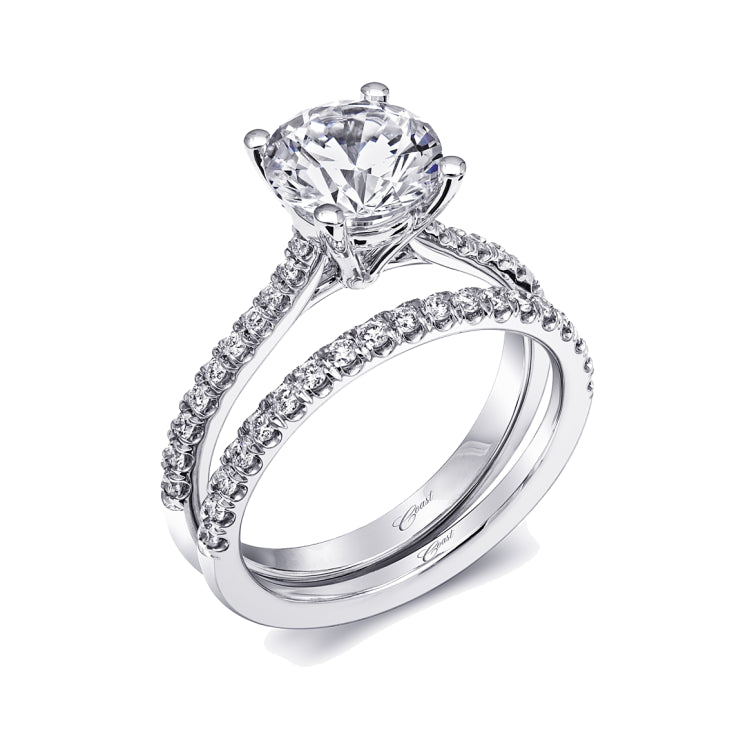 This delicate and refined engagement ring features intricately set diamonds on the shoulders of the ring, which complement a gorgeous 2 ct center stone. Shown with matching diamond band. Band sold separately.