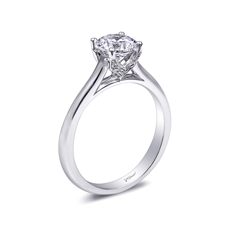 A timeless solitaire engagement ring sparkles with fine pave diamond details in the gallery. Shown with a 1 ct center stone.