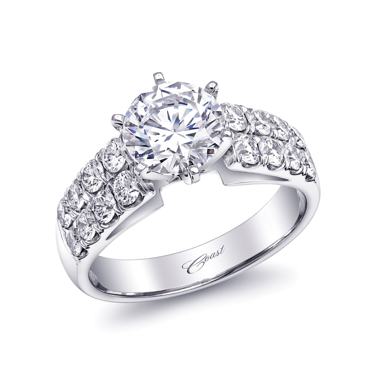 A sparkling statement, this engagement ring features two rows of diamonds on the shoulders of the ring. Built for a 1.5 ct round center stone.