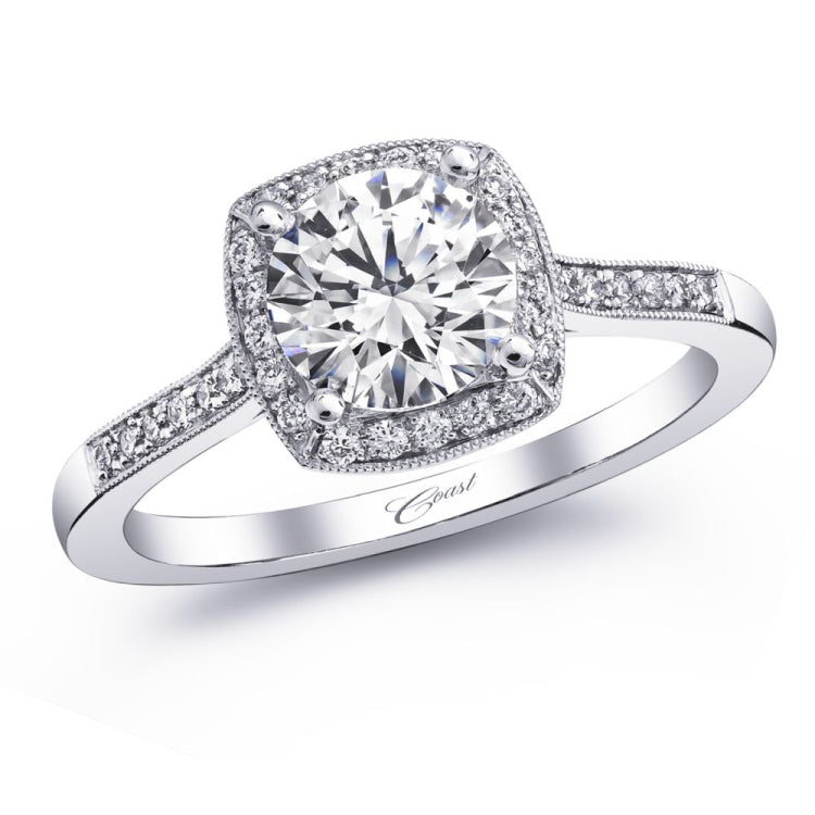 A gorgeous cushion halo design featuring a round center stone surrounded by fine pave set diamonds.