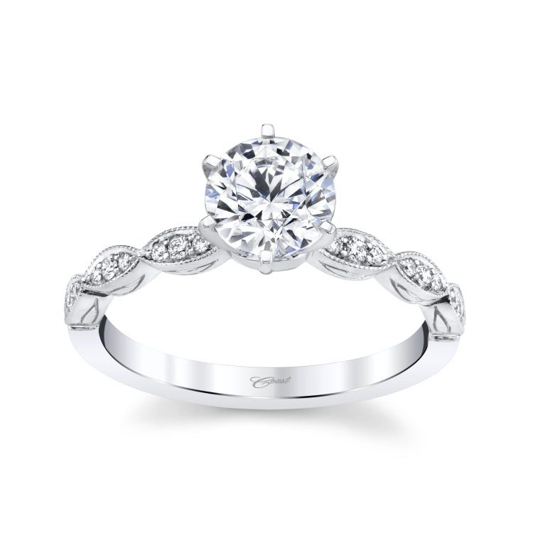A fashionable engagement ring featuring round brilliant diamonds set within a marquise motif. Shown in 14K white gold and accented with milgrain. Complete the piece with the center stone of your choice.