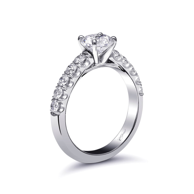 This timeless ring features fishtail set diamonds on the shoulders of the ring, and a traditional four prong setting for the center stone. Standard size created for a 1 ct center stone. Band sold separately.
