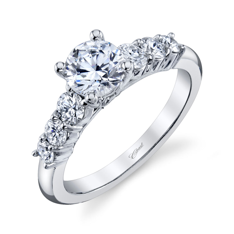 This dramatic and elegant engagement ring features diamonds set with stylish shared prongs. It comes with a 3/4 CT center stone.