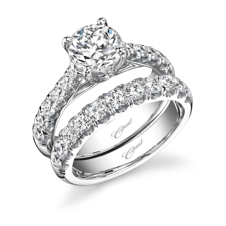 Graduated round diamonds grace the shoulders of this impressive engagement ring, with a band to match. A peek-a-boo diamond on the side of the head adds an exciting detail to this extraordinary wedding set. Band sold separately.