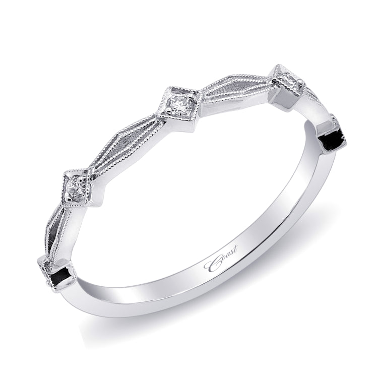 A dainty stackable band with round diamonds going half way around set in diamond shapes complete with milgrain edging.