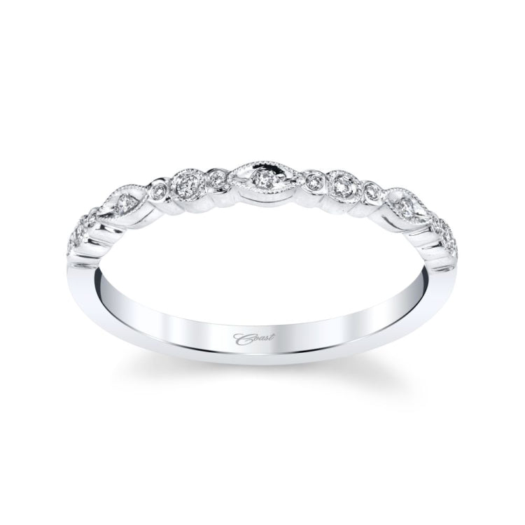 A delicate stackable band featuring round brilliant diamonds set within alternating marquise and round motifs. Milgrain edging adds to its glamour.