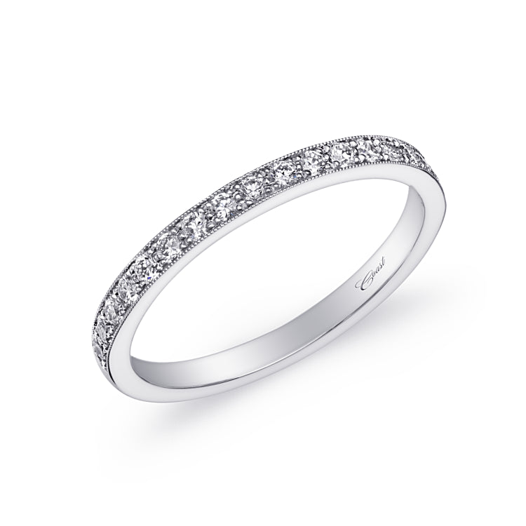 This elegant wedding band features fine pave set diamonds across the top half of the ring. Finished with delicate milgrain edging.