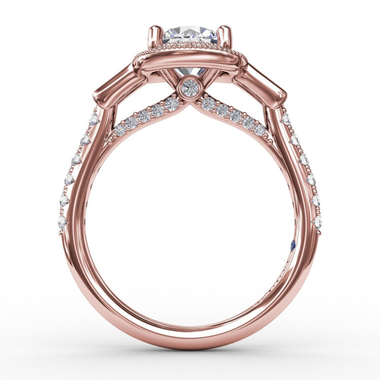Three-Stone Diamond Halo Engagement Ring With Baguette Side Stones