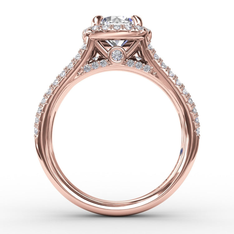 A cushion-shaped diamond halo surrounds the round diamond center stone, while the band delivers maximum sparkle—a little air between the three tapering rows of diamonds brings a bit of lightness to this super glamorous look. Available in platinum, 18KT & 14KT gold. Customize this design with an Authorized Fana Retailer.
