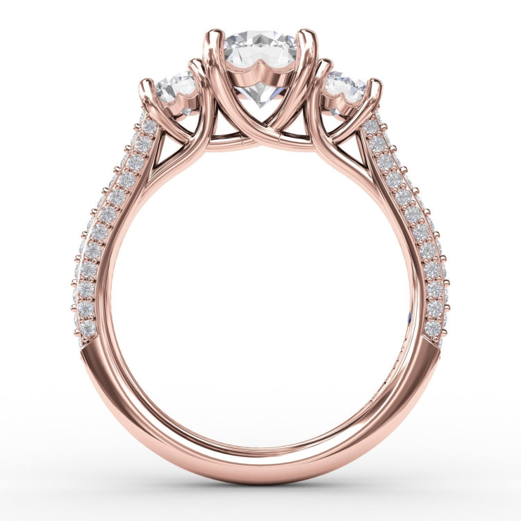 Classic Three-Stone Round Diamond Engagement Ring With Pavé Band