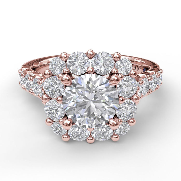 With a diamond-studded band and a cushion shaped halo of glittering diamonds, this engagement ring amplifies the beauty of your center stone. This bold halo engagement ring can be special ordered in any finger size, in Platinum, 18KT & 14KT gold and can be customized for any shape and size centerstone.