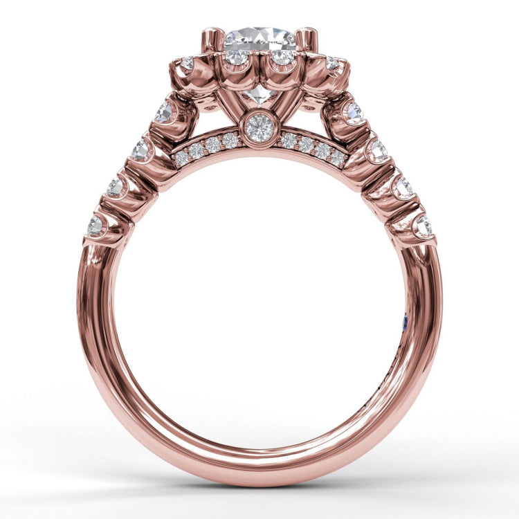 Take your engagement ring to the next level with a stunning border of diamonds that accentuates the perfection of the round diamond in this designer piece. This single row designer engagement ring is available in can be special ordered in any finger size, in Platinum, 18KT & 14KT gold and can be customized for any shape and size centerstone.