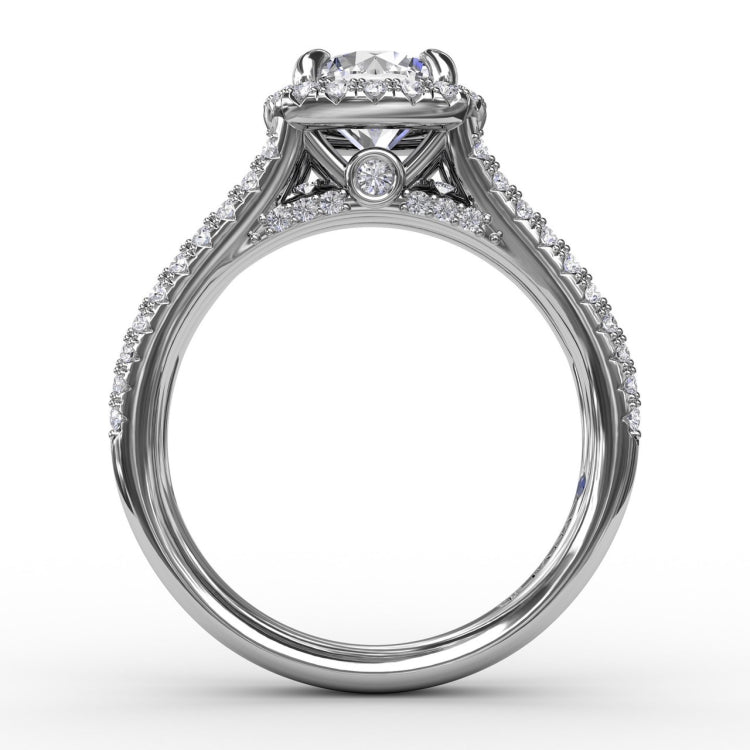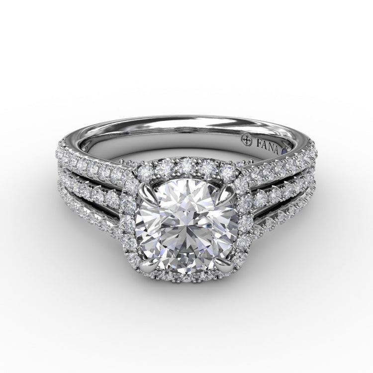 A cushion-shaped diamond halo surrounds the round diamond center stone, while the band delivers maximum sparkle—a little air between the three tapering rows of diamonds brings a bit of lightness to this super glamorous look. Available in platinum, 18KT & 14KT gold. Customize this design with an Authorized Fana Retailer.