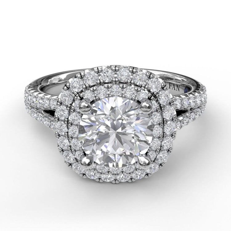 Stand out with a striking double halo that gives you ultimate glamour and impact. This halo engagement ring can be special ordered in any finger size, in Platinum, 18KT & 14KT gold and can be customized for any shape and size centerstone.