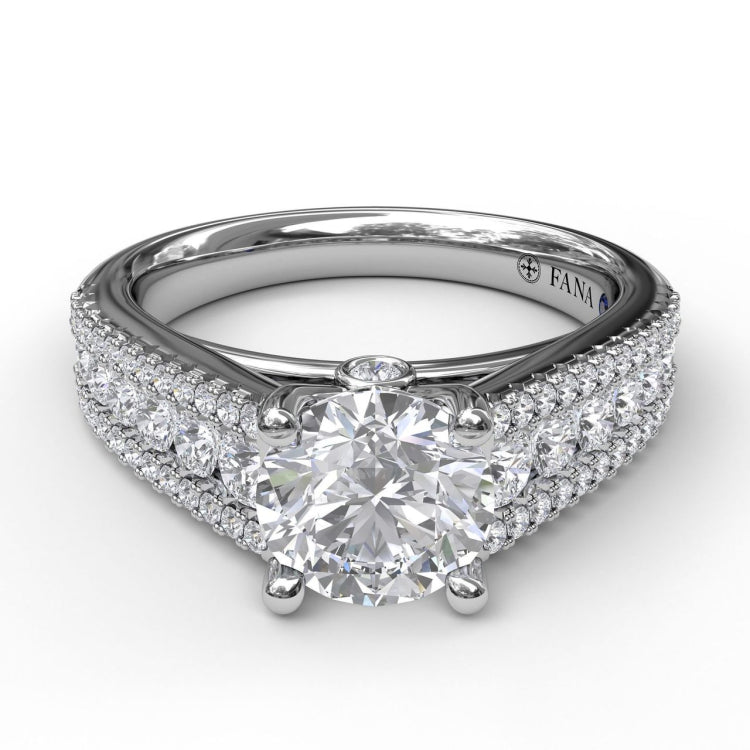 Tapered round diamonds and a triple row elevate the shine of the ring's beauty. This gorgeous style will effortlessly capture the many facets of your love story. This engagement ring can be special ordered in any finger size, in Platinum, 18KT & 14KT gold and can be customized for any shape and size centerstone.