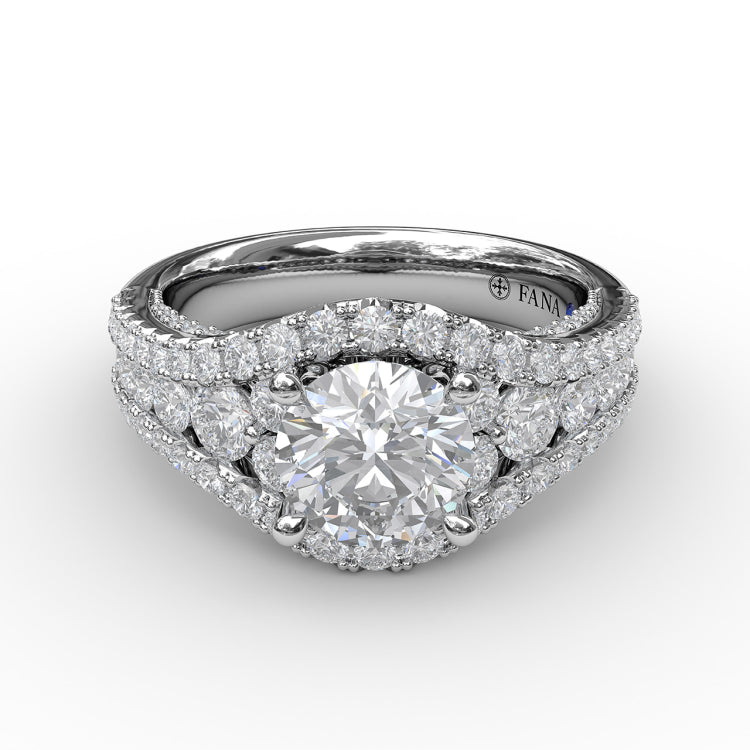 Three strands of graduated diamonds converge then open to create a halo as they envelope the center, providing shine, volume and movement. This engagement ring can be special ordered in any finger size, in Platinum, 18KT & 14KT gold and can be customized for any shape and size centerstone.