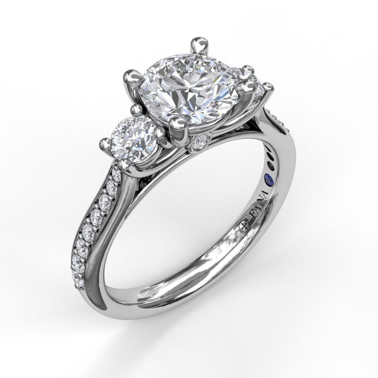 This engagement ring kicks the shine factor of the classic three-stone up notch with a diamond-laced band that sweeps toward the graceful trio. This classic three stone single row engagement ring can be special ordered in any finger size, in Platinum, 18KT & 14KT gold and can be customized for any shape and size centerstone.