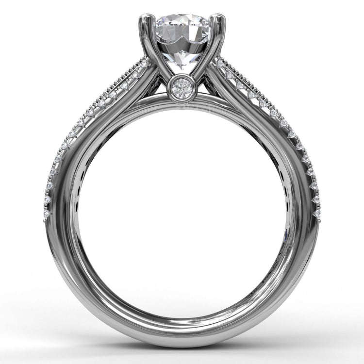 Three rows of diamonds of varying sizes in the channel of the band serve as the most brilliant of backdrops for the round center stone of this impressive engagement ring. Milgrain detailing adds an extra touch of sophistication and interest. This engagement ring can be special ordered in any finger size, in Platinum, 18KT & 14KT gold and can be customized for any shape and size centerstone.