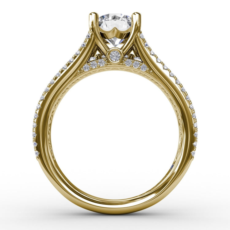 A classic round diamond engagement ring, with a band that sings in three-part harmony: Two rows of delicate pavé diamonds border a central row of larger round diamonds, adding extra sparkle—and a dramatic presence on the hand. Available in platinum, 18KT & 14KT gold. Customize this design with an Authorized Fana Retailer.