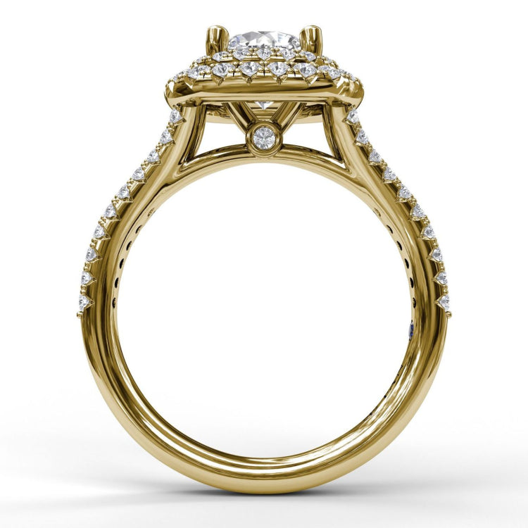Stand out with a striking double halo that gives you ultimate glamour and impact. This halo engagement ring can be special ordered in any finger size, in Platinum, 18KT & 14KT gold and can be customized for any shape and size centerstone.