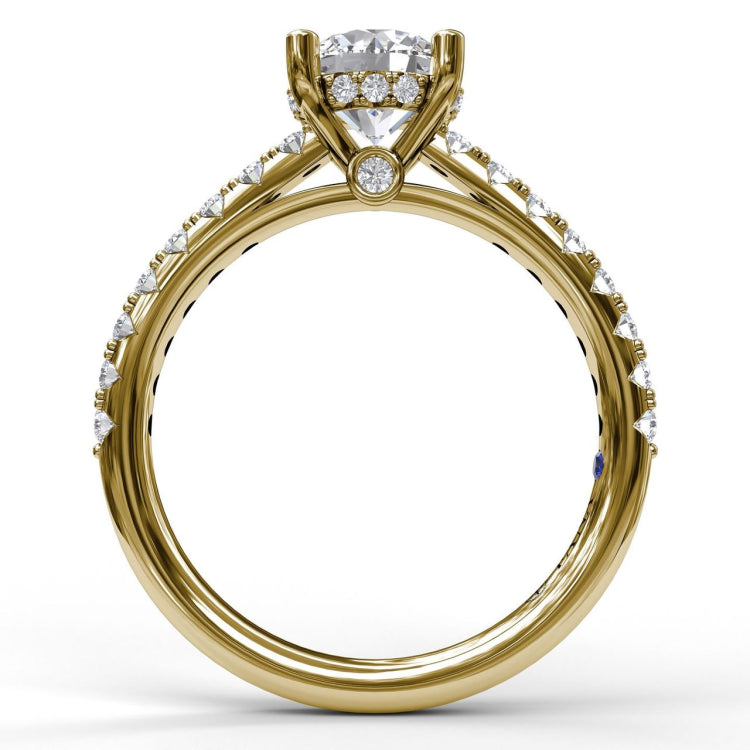 This timeless design has both classic appeal and a contemporary look with an subtle diamond under the center stone and a glimmering band. This single row detailed engagement ring can be special ordered in any finger size, in Platinum, 18KT & 14KT gold and can be customized for any shape and size centerstone.