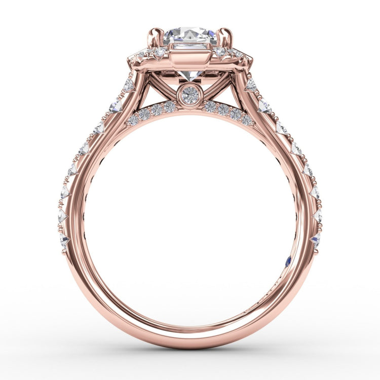 This Art Deco-inspired version of our popular cushion-shaped halo engagement ring features a clean, crisp arrangement of accent stones, including four bezel-set baguettes, and a trail of graduated round diamonds on the band. Available in platinum, 18KT & 14KT gold. Customize this design with an Authorized Fana Retailer.