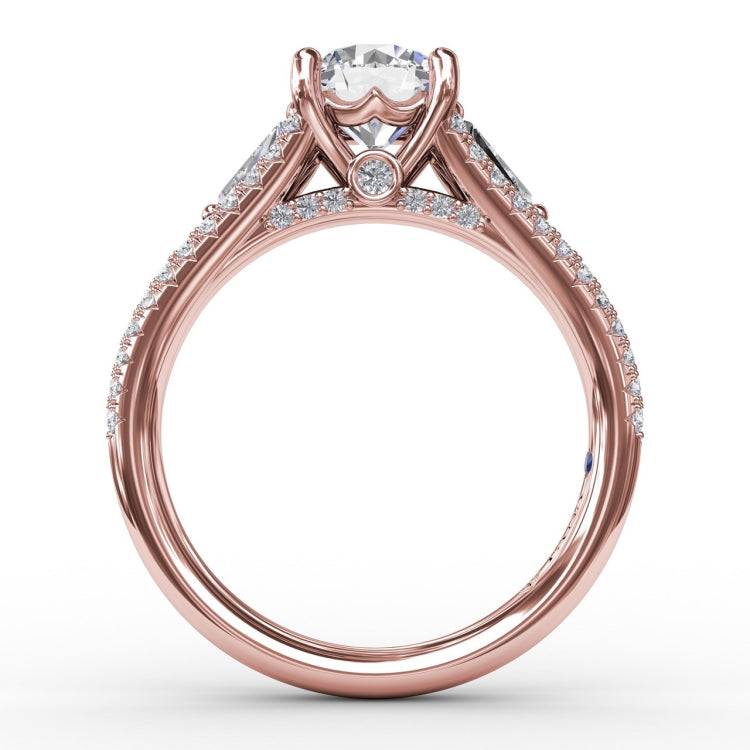 Three-Stone Round Diamond Engagement Ring With Split Diamond Shank and Baguette Side Stones