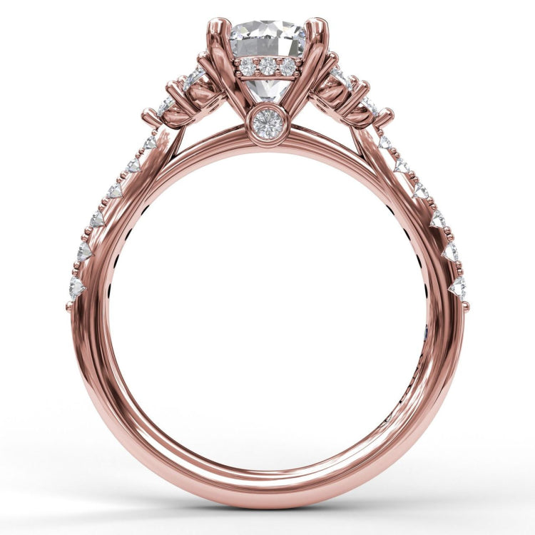 This engagement ring kicks the shine factor of the classic three-stone up notch with a diamond-laced band that sweeps toward the graceful trio of side diamonds. This inventive three stone single row engagement ring can be special ordered in any finger size, in Platinum, 18KT & 14KT gold and can be customized for any shape and size centerstone.
