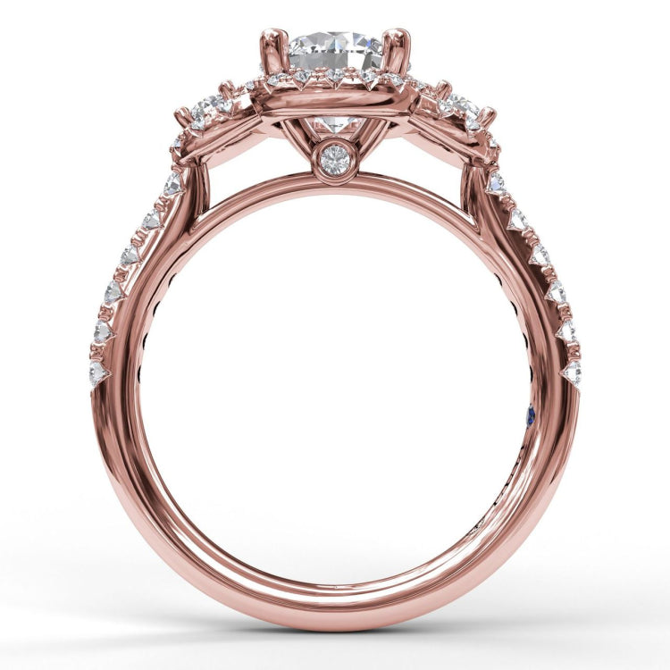 Two haloed diamonds flank this ring's magnificent center stone, enriching its glamour. This three stone halo engagement ring can be special ordered in any finger size, in Platinum, 18KT & 14KT gold and can be customized for any shape and size centerstone.