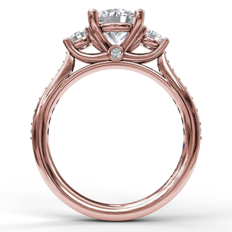 This engagement ring kicks the shine factor of the classic three-stone up notch with a diamond-laced band that sweeps toward the graceful trio. This classic three stone single row engagement ring can be special ordered in any finger size, in Platinum, 18KT & 14KT gold and can be customized for any shape and size centerstone.