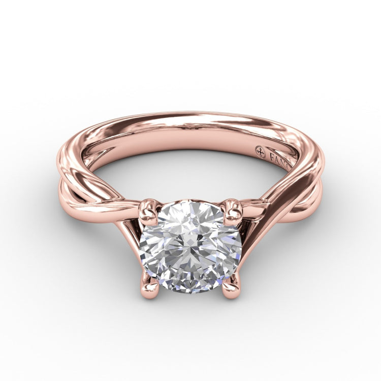 Strong twists of metal entwine as they approach the scintillating round cut of this captivating ring. This engagement ring can be special ordered in any finger size, in Platinum, 18KT & 14KT gold and can be customized for any shape and size centerstone.