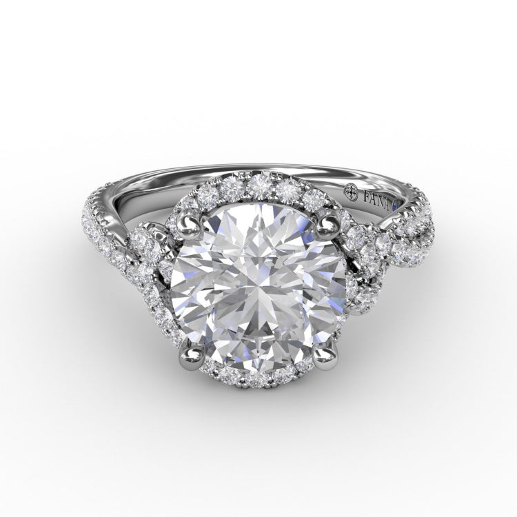 Meandering ribbons of diamonds overlap each other and meet at the center stone, forming a loop at the top, so that the diamond halo “threads†through the shank on both sides. It’s an intricate design requiring the highest level of craftsmanship and attention to detail. Available in platinum, 18KT & 14KT gold. Customize this design with an Authorized Fana Retailer.