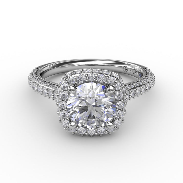 Every inch of this ring sparkles, from the cushion-shaped waterfall halo to the band, which is completely encrusted in diamonds. Our signature bead-set prongs bring in a touch of subtle texture. Available in platinum, 18KT & 14KT gold. Customize this design with an Authorized Fana Retailer.