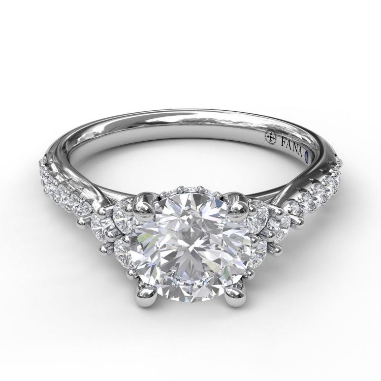 This engagement ring kicks the shine factor of the classic three-stone up notch with a diamond-laced band that sweeps toward the graceful trio of side diamonds. This inventive three stone single row engagement ring can be special ordered in any finger size, in Platinum, 18KT & 14KT gold and can be customized for any shape and size centerstone.
