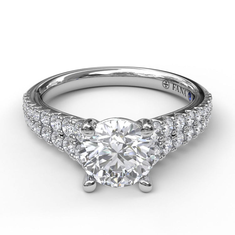 Two rows of elegant diamonds embody the timelessness of your romance in this charming ring style. This double row graduated engagement ring can be special ordered in any finger size, in Platinum, 18KT & 14KT gold and can be customized for any shape and size centerstone.