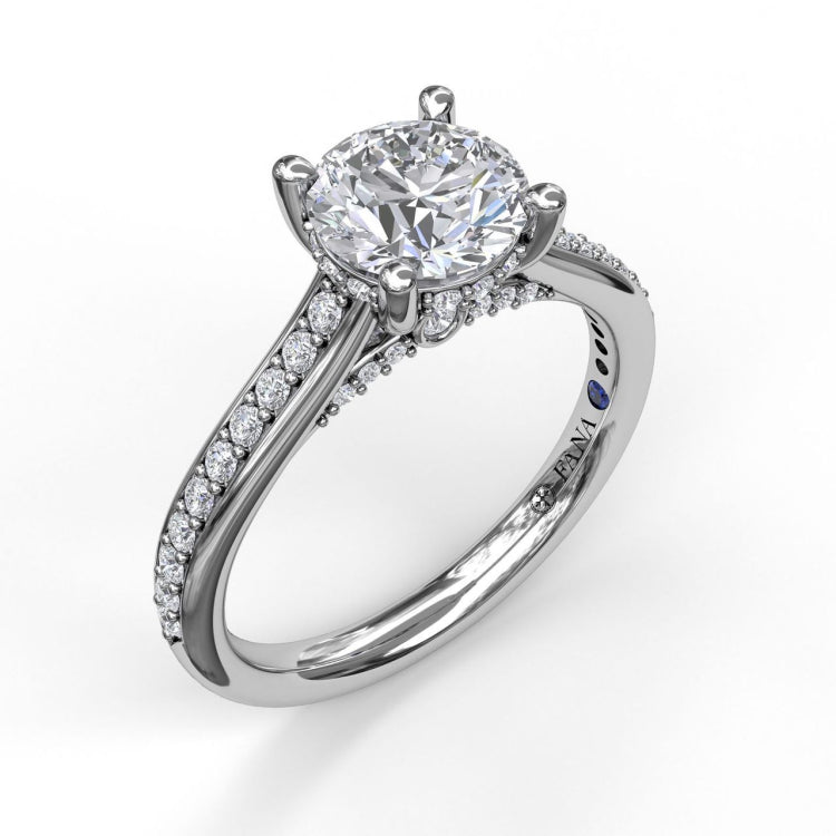 This beloved design features a classic round cut held above a glamorous row of rounds laced in the band while surprise diamonds shine from underneath. This classic single row diamond engagement ring can be special ordered in any finger size, in Platinum, 18KT & 14KT gold and can be customized for any shape and size centerstone.