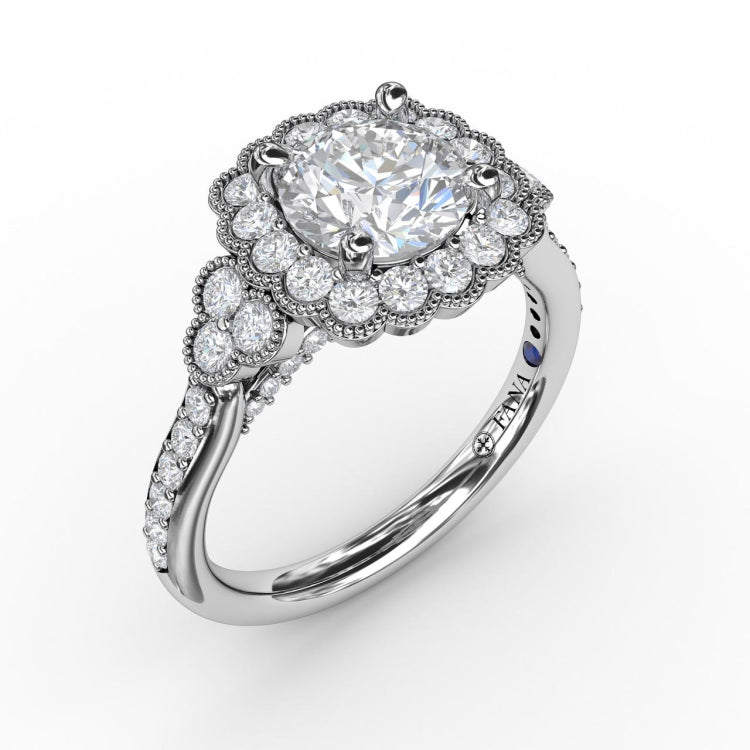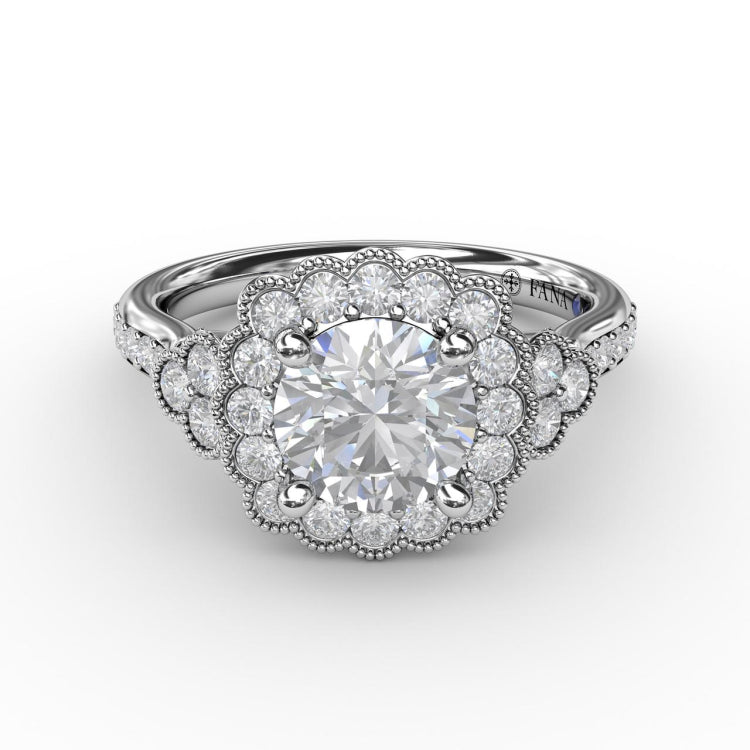 The center stone of this engagement ring is enhanced by the subtle floral shape created by the sparkling halo and gorgeous accent diamonds climbing up the band. This floral cushion halo engagement ring can be special ordered in any finger size, in Platinum, 18KT & 14KT gold and can be customized for any shape and size centerstone.