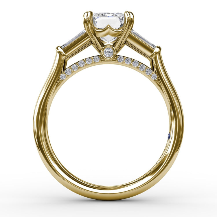 This “three-stone” engagement ring style is actually a five-stone affair: Twin pairings of tapered baguettes on each side of the emerald-cut center stone bring extra sparkle—and something unexpected—to this classic style. Available in platinum, 18KT & 14KT gold. Customize this design with an Authorized Fana Retailer.
