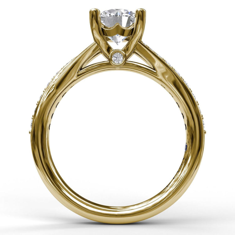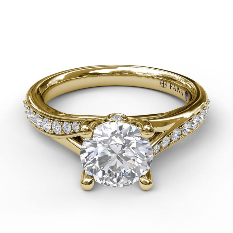 Though the split band style of this ring is subtle, it is no less remarkable. A delicate row of diamonds opens up to perfectly frame the center diamond. This stunning engagement ring can be special ordered in any finger size, in Platinum, 18KT & 14KT gold and can be customized for any shape and size centerstone.