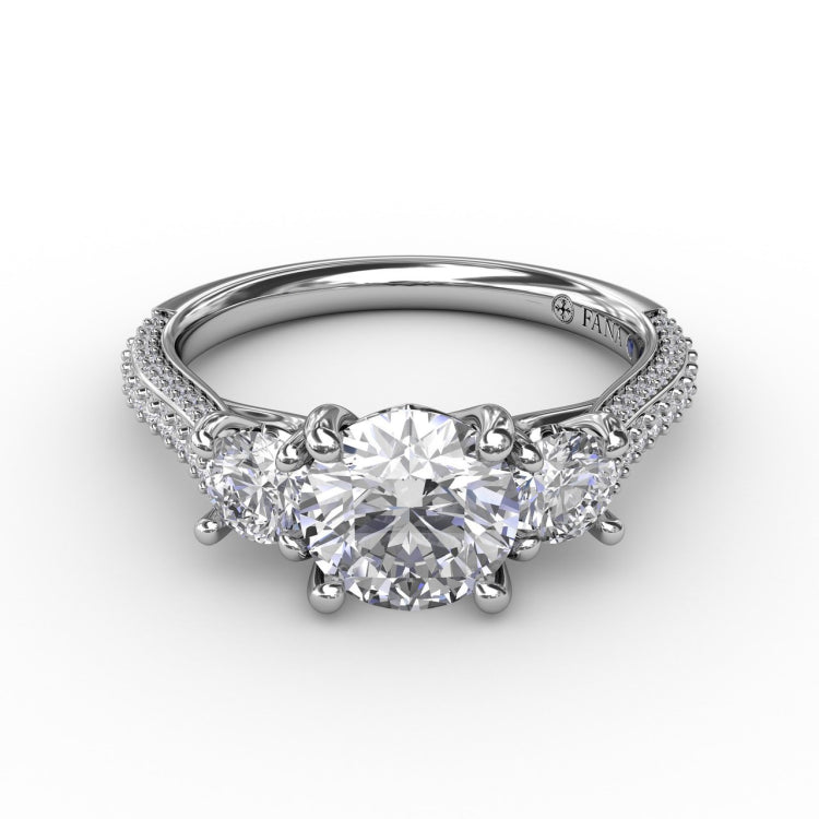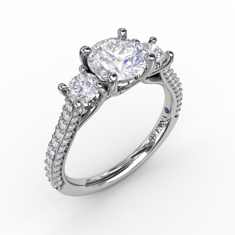 Classic Three-Stone Round Diamond Engagement Ring With Pavé Band