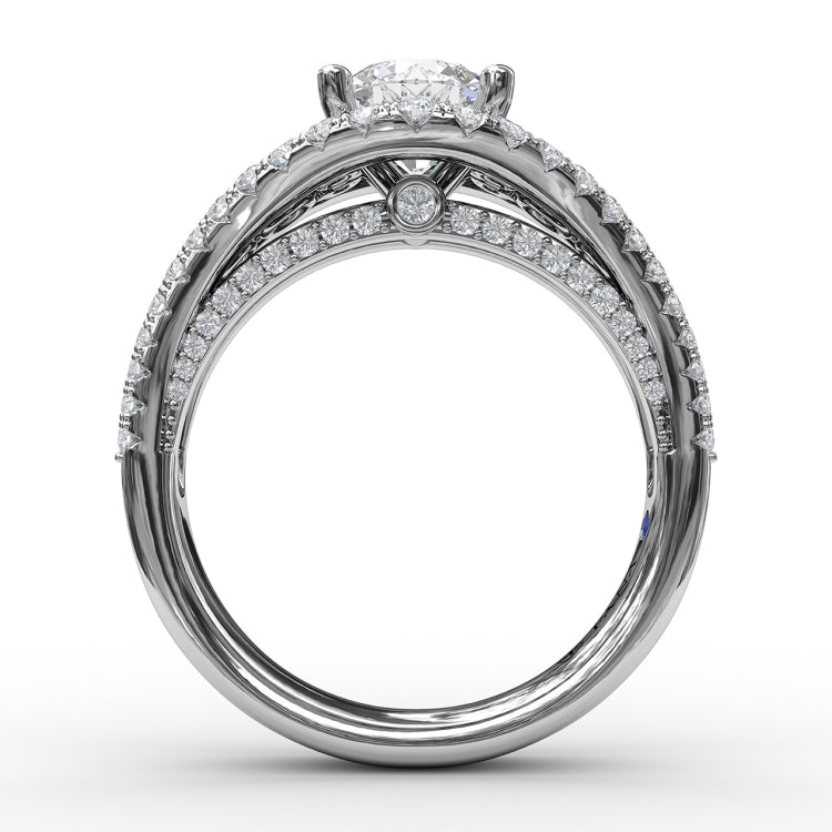Three strands of graduated diamonds converge then open to create a halo as they envelope the center, providing shine, volume and movement. This engagement ring can be special ordered in any finger size, in Platinum, 18KT & 14KT gold and can be customized for any shape and size centerstone.