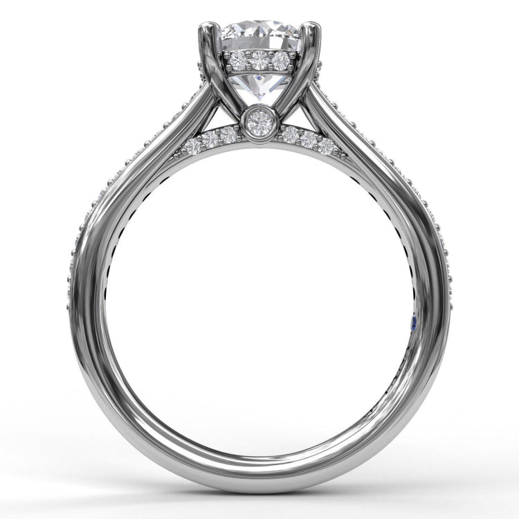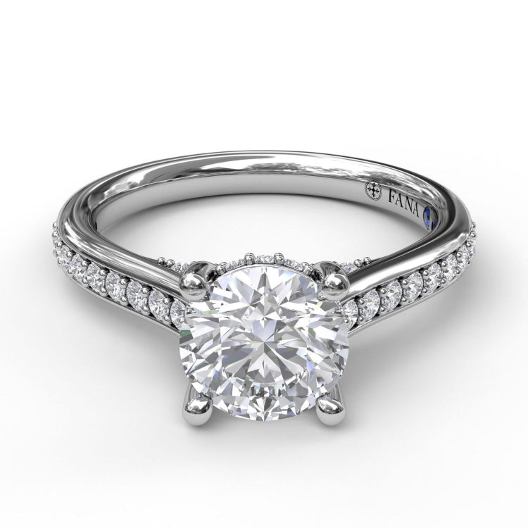 This beloved design features a classic round cut held above a glamorous row of rounds laced in the band while surprise diamonds shine from underneath. This classic single row diamond engagement ring can be special ordered in any finger size, in Platinum, 18KT & 14KT gold and can be customized for any shape and size centerstone.